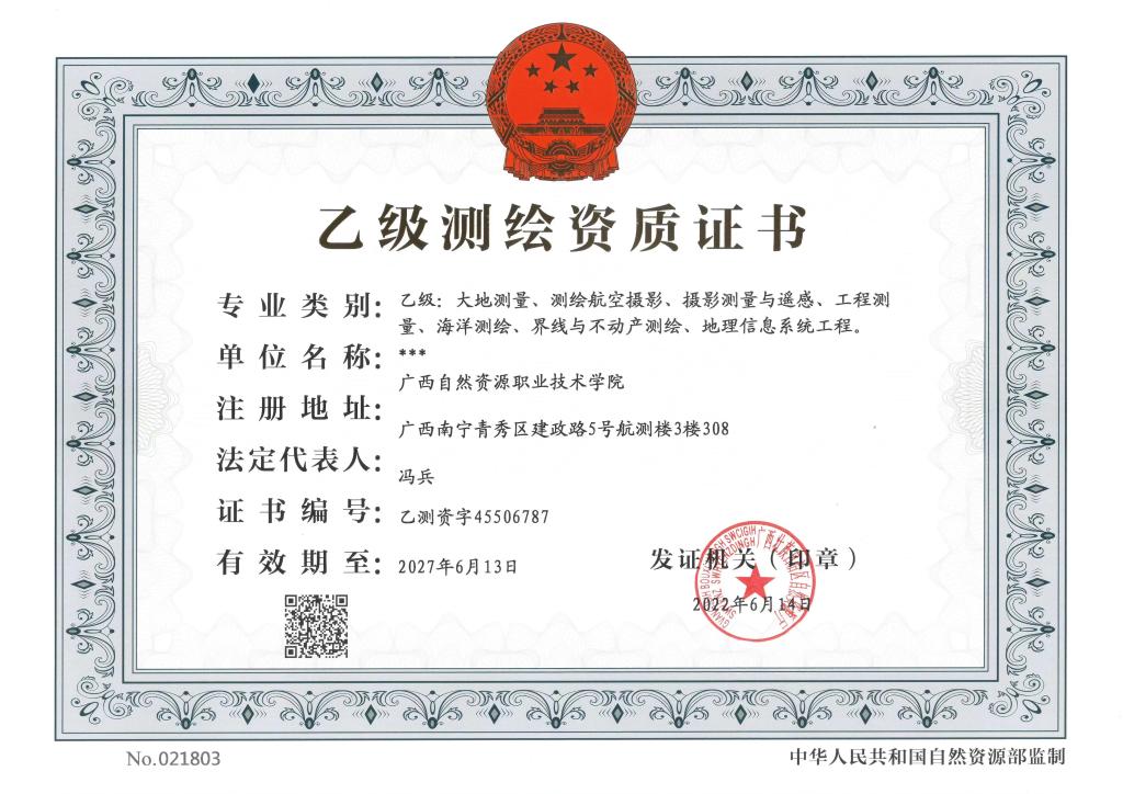 2022年6月15日,自然资源厅为学院颁发了扩项后的乙级测绘资质证书。本次测绘资质扩项,由原来的二个专业扩展为七个专业,分别为:工程测量、界线与不动产测绘、大地测量、测绘航空摄影、摄影测量与遥感、海洋测绘、地理信息系统工程。