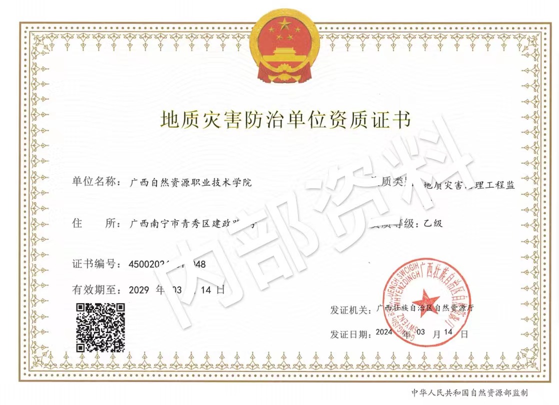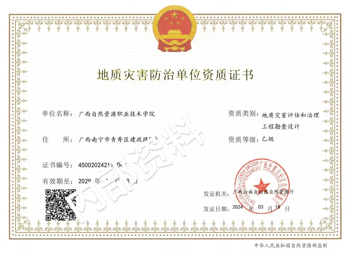 近日,从广西自然资源厅传来喜讯,我院成功取得《地质灾害评估和治理工程勘查设计(乙级)》和《地质灾害治理工程监理(乙级)》,此项资质的成功申报,彰显了我院在人才队伍、业务水平及综合能力等方面又取得了一张“入场券”,为学院创新教育模式、盘活单位资源、提升行业知名度等方面提供十分重要的意义。